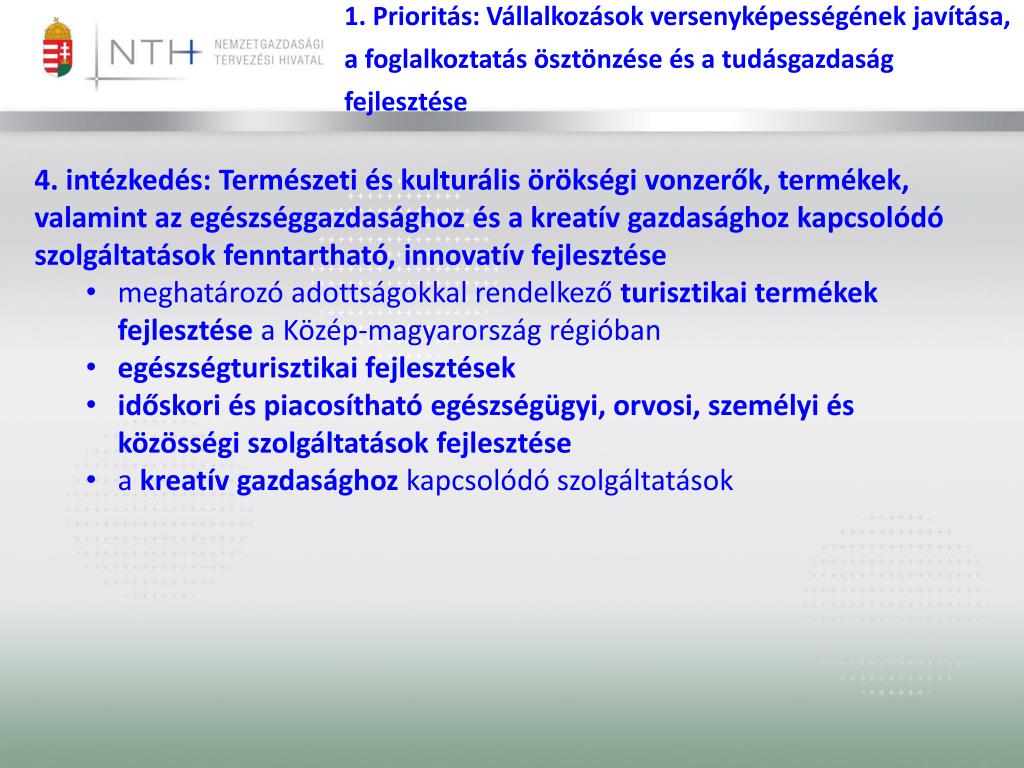 1. Prioritás: Vállalkozások versenyképességének javítása, a foglalkoztatás ösztönzése és a tudásgazdaság fejlesztése • 4. intézkedés: Természeti és kulturális örökségi vonzerők, termékek, valamint az egészséggazdasághoz és a kreatív gazdasághoz kapcsolódó szolgáltatások fenntartható, innovatív fejlesztése • meghatározó adottságokkal rendelkező turisztikai termékek fejlesztése a Közép-magyarország régióban • egészségturisztikai fejlesztések • időskori és piacosítható egészségügyi, orvosi, személyi és közösségi szolgáltatások fejlesztése • a kreatív gazdasághoz kapcsolódó szolgáltatások