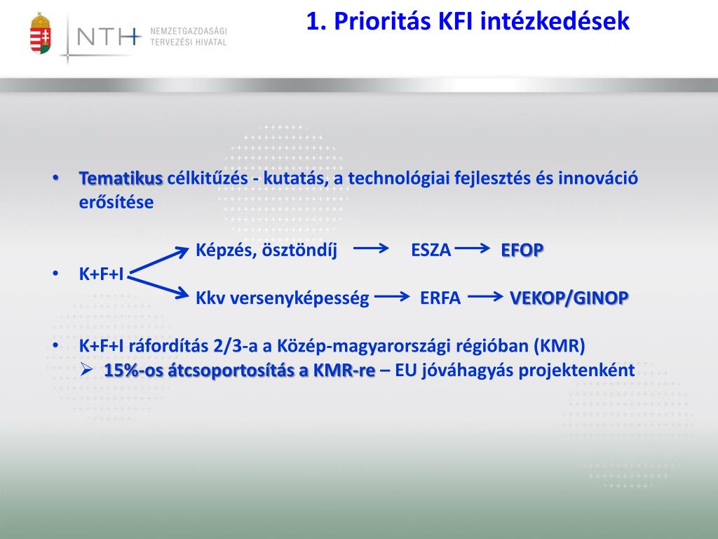 1. Prioritás KFI intézkedések • Tematikus célkitűzés - kutatás, a technológiai fejlesztés és innováció erősítése • Képzés, ösztöndíj ESZA EFOP • K+F+I • Kkv versenyképesség ERFA VEKOP/GINOP • K+F+I ráfordítás 2/3-a a Közép-magyarországi régióban (KMR) • 15%-os átcsoportosítás a KMR-re– EU jóváhagyás projektenként