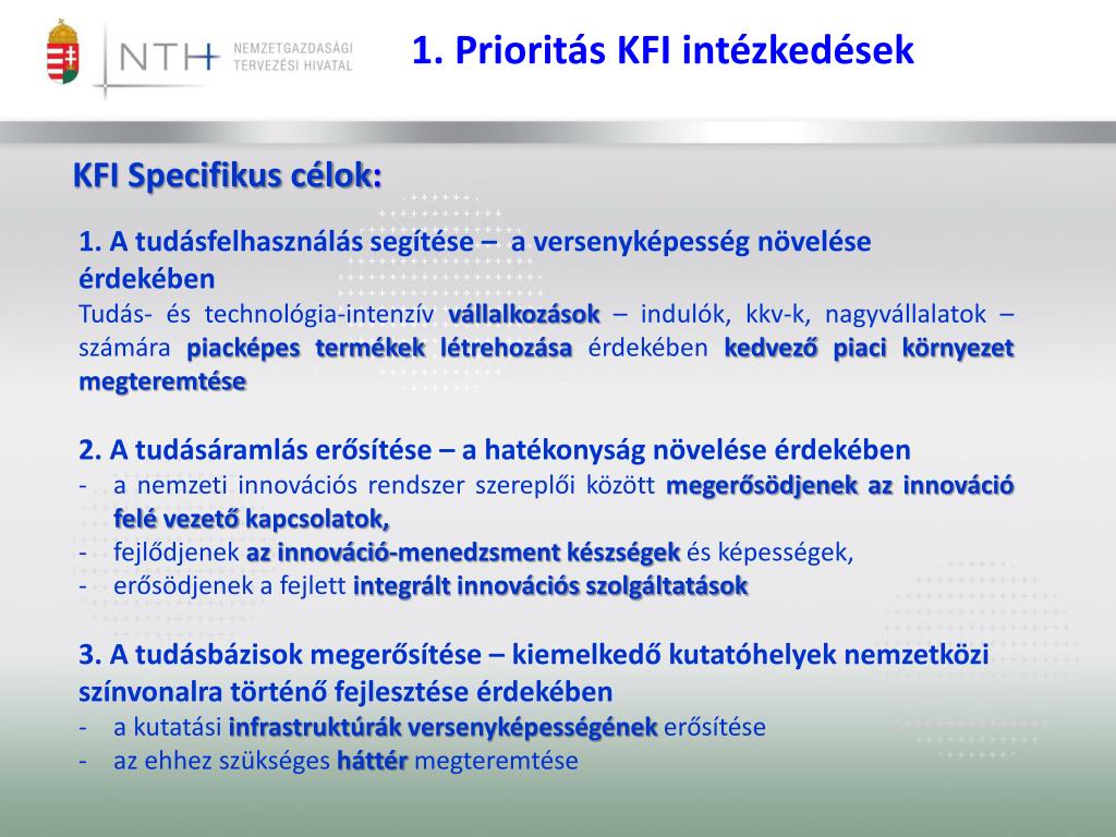 1. Prioritás KFI intézkedések KFI Specifikus célok: • 1. A tudásfelhasználás segítése – a versenyképesség növelése érdekében • Tudás- és technológia-intenzív vállalkozások – indulók, kkv-k, nagyvállalatok – számára piacképes termékek létrehozása érdekében kedvező piaci környezet megteremtése • 2. A tudásáramlás erősítése – a hatékonyság növelése érdekében • a nemzeti innovációs rendszer szereplői között megerősödjenek az innováció felé vezető kapcsolatok, • fejlődjenek az innováció-menedzsment készségek és képességek, • erősödjenek a fejlett integrált innovációs szolgáltatások • 3. A tudásbázisok megerősítése – kiemelkedő kutatóhelyek nemzetközi színvonalra történő fejlesztése érdekében • a kutatási infrastruktúrák versenyképességének erősítése • az ehhez szükséges háttérmegteremtése