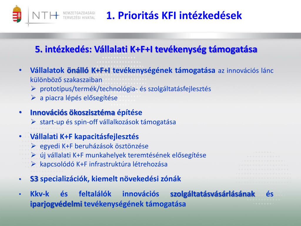 1. Prioritás KFI intézkedések • 5. intézkedés: Vállalati K+F+I tevékenység támogatása • Vállalatok önálló K+F+I tevékenységének támogatása az innovációs lánc különböző szakaszaiban • prototípus/termék/technológia- és szolgáltatásfejlesztés • a piacra lépés elősegítése • Innovációs ökoszisztéma építése • start-up és spin-off vállalkozások támogatása • Vállalati K+F kapacitásfejlesztés • egyedi K+F beruházások ösztönzése • új vállalati K+F munkahelyek teremtésének elősegítése • kapcsolódó K+F infrastruktúra létrehozása • S3specializációk, kiemelt növekedési zónák • Kkv-k és feltalálók innovációs szolgáltatásvásárlásának és iparjogvédelmi tevékenységének támogatása