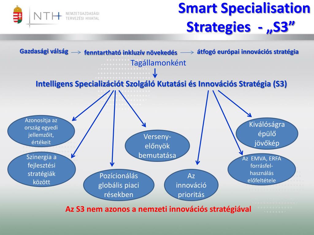 SmartSpecialisation • Strategies - „S3” Gazdasági válság átfogó európai innovációs stratégia fenntartható inkluzív növekedés Tagállamonként Intelligens Specializációt Szolgáló Kutatási és Innovációs Stratégia (S3) Az S3nem azonos a nemzeti innovációs stratégiával Azonosítja az ország egyedi jellemzőit, értékeit Kiválóságra épülő jövőkép Verseny-előnyök bemutatása Szinergia a fejlesztési stratégiák között Az EMVA, ERFA forrásfel-használás előfeltétele Pozícionálás globális piaci résekben Az innováció prioritás