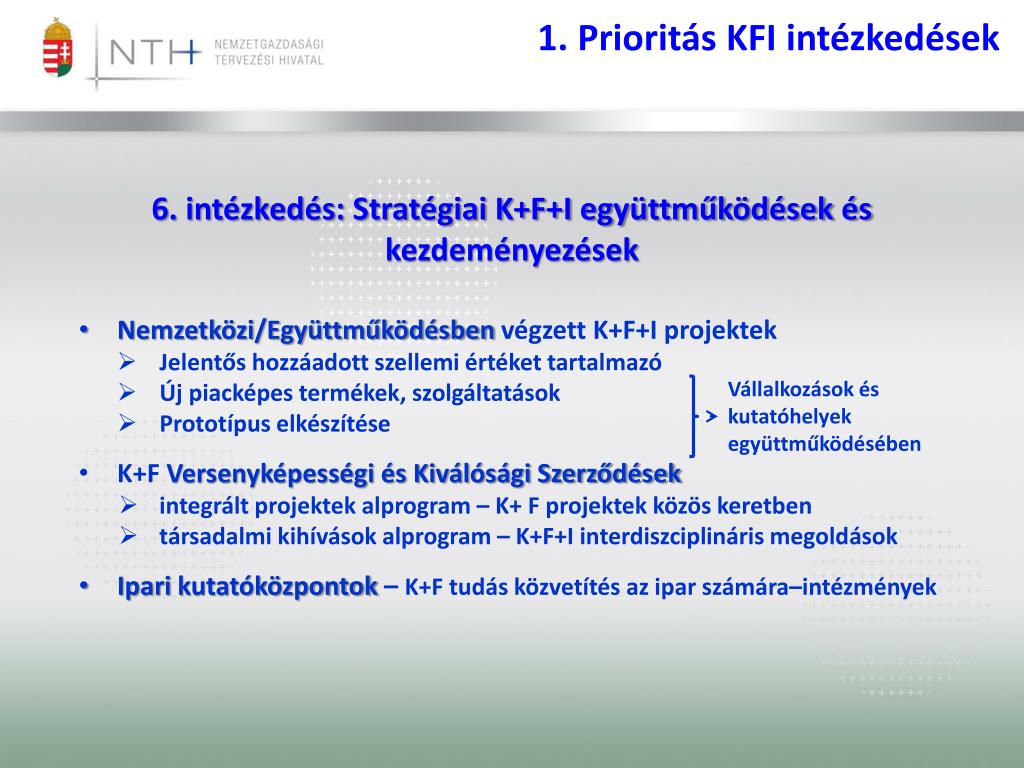 1. Prioritás KFI intézkedések • 6. intézkedés: Stratégiai K+F+I együttműködések és kezdeményezések • Nemzetközi/Együttműködésbenvégzett K+F+I projektek • Jelentős hozzáadott szellemi értéket tartalmazó • Új piacképes termékek, szolgáltatások • Prototípus elkészítése • K+F Versenyképességi és Kiválósági Szerződések • integrált projektek alprogram – K+ F projektek közös keretben • társadalmi kihívások alprogram – K+F+I interdiszciplináris megoldások • Ipari kutatóközpontok – K+F tudás közvetítés az ipar számára–intézmények Vállalkozások és kutatóhelyek együttműködésében
