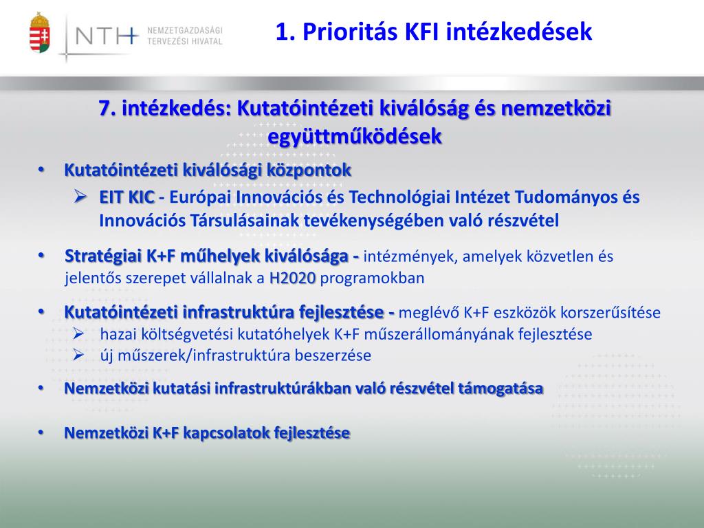 1. Prioritás KFI intézkedések • 7. intézkedés: Kutatóintézeti kiválóság és nemzetközi együttműködések • Kutatóintézeti kiválósági központok • EIT KIC - Európai Innovációs és Technológiai Intézet Tudományos és Innovációs Társulásainak tevékenységében való részvétel • Stratégiai K+F műhelyek kiválósága - intézmények, amelyek közvetlen és jelentős szerepet vállalnak a H2020 programokban • Kutatóintézeti infrastruktúra fejlesztése -meglévő K+F eszközök korszerűsítése • hazai költségvetési kutatóhelyek K+F műszerállományának fejlesztése • új műszerek/infrastruktúra beszerzése • Nemzetközi kutatási infrastruktúrákban való részvétel támogatása • Nemzetközi K+F kapcsolatok fejlesztése