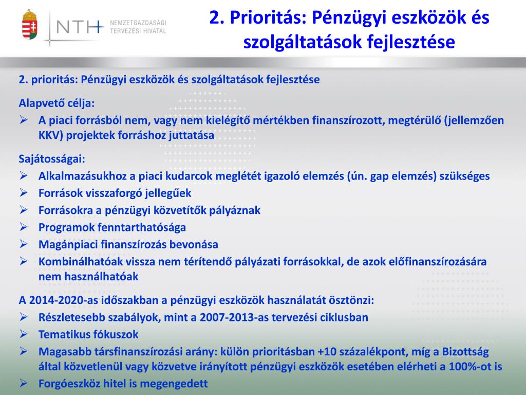 2. Prioritás • Tervezett eszköztípusok: • Refinanszírozás: hitel, faktoring, lízing programok keretében olcsó refinanszírozási forrás biztosítása a pénzügyi közvetítőknek, akik ezt a forrást továbbítják a végső kedvezményezettek részére • Garanciaeszközök (közvetlen, illetve viszontgarancia az előző pontban említett területeken) • Tőkeprogramok (piaci alapon befektető kockázati tőke, vegyes szempontok szerint befektető állami tőkealap) • Pénzügyi eszközöket és vissza nem térítendő források kombinációja (pénzügyi eszközök kiegészítő alkalmazása vissza nem térítendő támogatási programoknál) • Pénzügyi közvetítők fejlesztése (hasonló a JASMINE programhoz, támogatásközvetítéshez szükséges informatikai háttér, képzések az eredményes és hatékony forrásközvetítés érdekében)