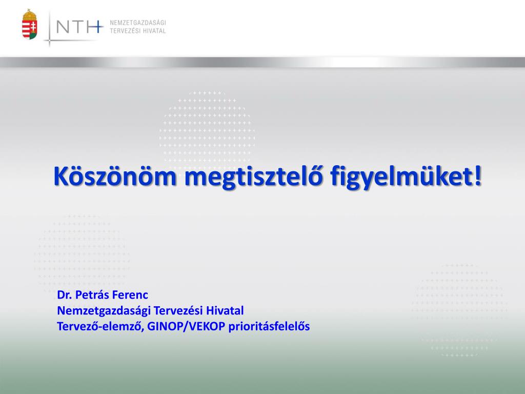 Köszönöm megtisztelő figyelmüket! Dr. Petrás Ferenc Nemzetgazdasági Tervezési Hivatal Tervező-elemző, GINOP/VEKOP prioritásfelelős