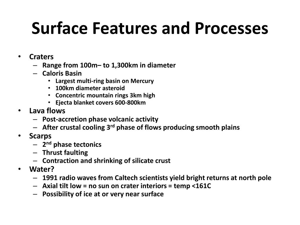 Surface Features and Processes • Craters • Range from 100m– to 1,300km in diameter • Caloris Basin • Largest multi-ring basin on Mercury • 100km diameter asteroid • Concentric mountain rings 3km high • Ejecta blanket covers 600-800km • Lava flows • Post-accretion phase volcanic activity • After crustal cooling 3rd phase of flows producing smooth plains • Scarps • 2nd phase tectonics • Thrust faulting • Contraction and shrinking of silicate crust • Water? • 1991 radio waves from Caltech scientists yield bright returns at north pole • Axial tilt low = no sun on crater interiors = temp <161C • Possibility of ice at or very near surface