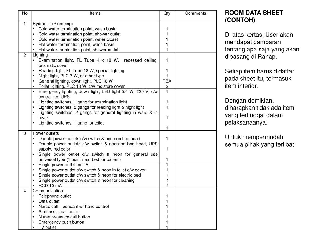 ROOM DATA SHEET (CONTOH)Di atas kertas, User akan mendapat gambaran tentang apa saja yang akan dipasang di Ranap.Setiap item harus didaftar pada sheet itu, termasuk item interior. Dengan demikian, diharapkan tidak ada item yang tertinggal dalam pelaksanaanya.Untuk mempermudah semua pihak yang terlibat.