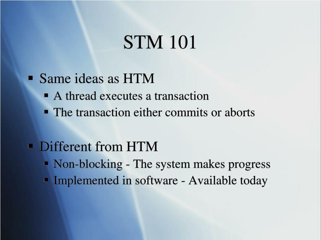 STM 101 • Same ideas as HTM • A thread executes a transaction • The transaction either commits or aborts • Different from HTM • Non-blocking - The system makes progress • Implemented in software - Available today