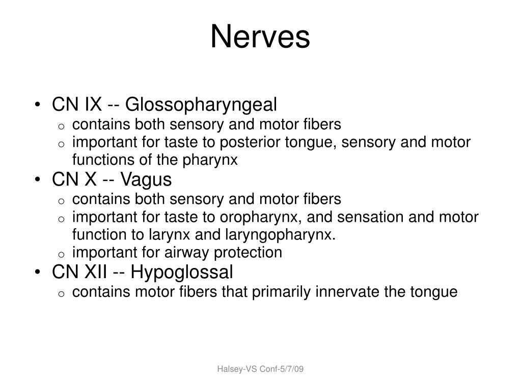 Nerves • CN IX -- Glossopharyngeal • contains both sensory and motor fibers • important for taste to posterior tongue, sensory and motor functions of the pharynx • CN X -- Vagus • contains both sensory and motor fibers • important for taste to oropharynx, and sensation and motor function to larynx and laryngopharynx. • important for airway protection • CN XII -- Hypoglossal • contains motor fibers that primarily innervate the tongue Halsey-VS Conf-5/7/09