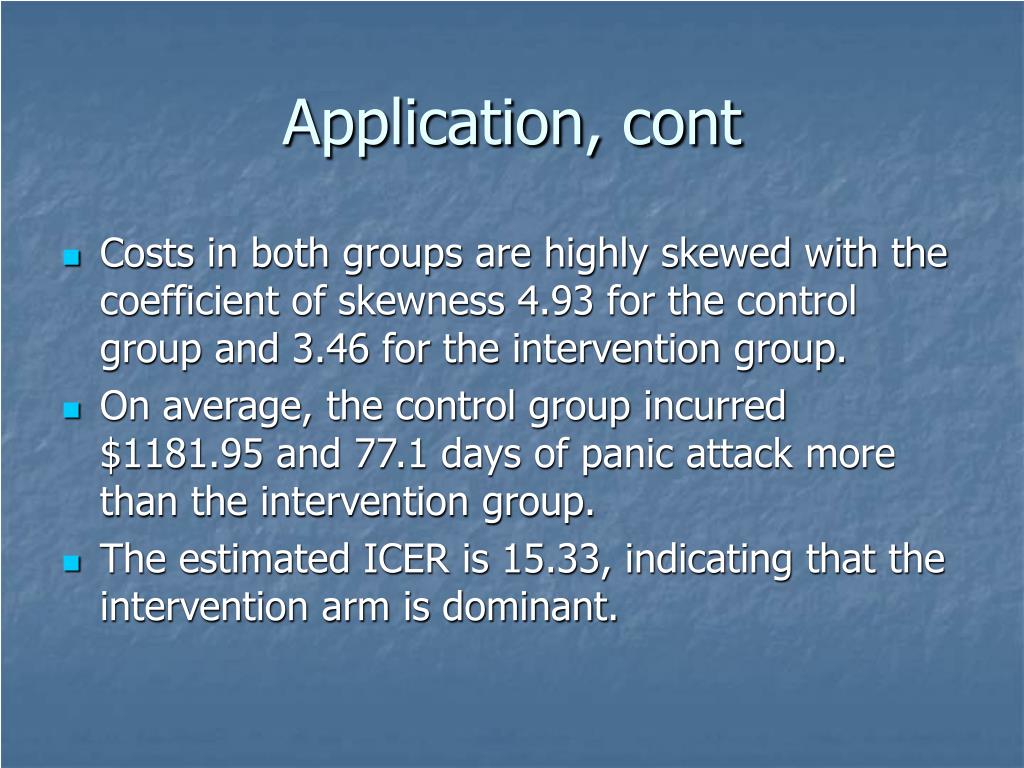 Application, cont • Costs in both groups are highly skewed with the coefficient of skewness 4.93 for the control group and 3.46 for the intervention group. • On average, the control group incurred $1181.95 and 77.1 days of panic attack more than the intervention group. • The estimated ICER is 15.33, indicating that the intervention arm is dominant.
