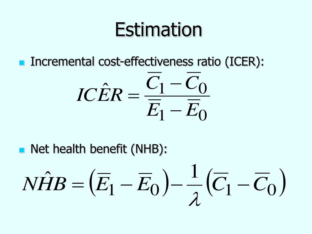 Estimation • Incremental cost-effectiveness ratio (ICER): • Net health benefit (NHB):