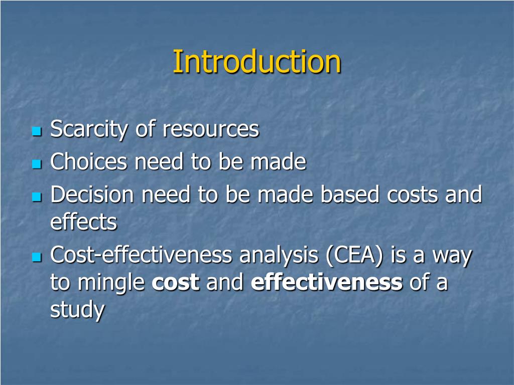 Introduction • Scarcity of resources • Choices need to be made • Decision need to be made based costs and effects • Cost-effectiveness analysis (CEA) is a way to mingle cost and effectiveness of a study