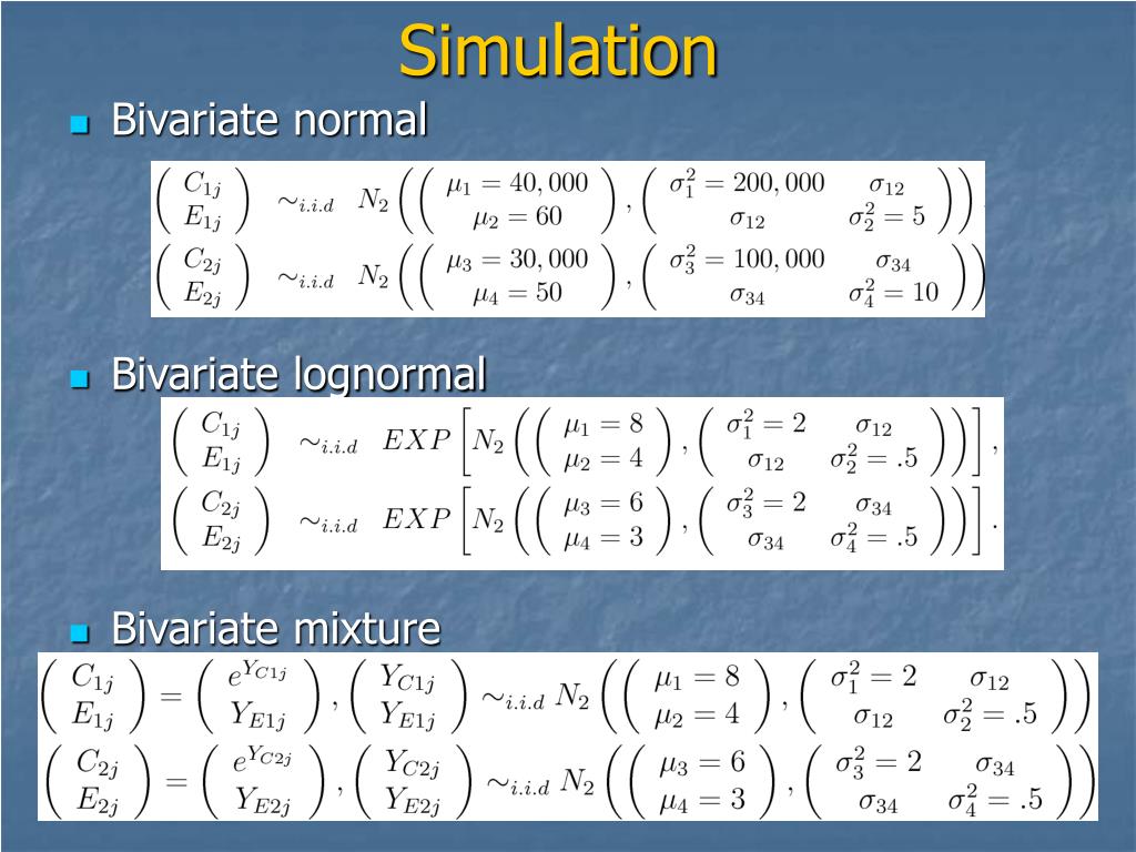 Simulation • Bivariate normal • Bivariate lognormal • Bivariate mixture