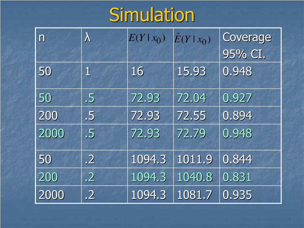 Simulation • The model • Specify λ, β, γ • Generate X ~ uniform • ε ~ normal(0, 1) • g2(Zi, γ) = exp(ZiTγ) • Objective: estimate E(Y|x0)