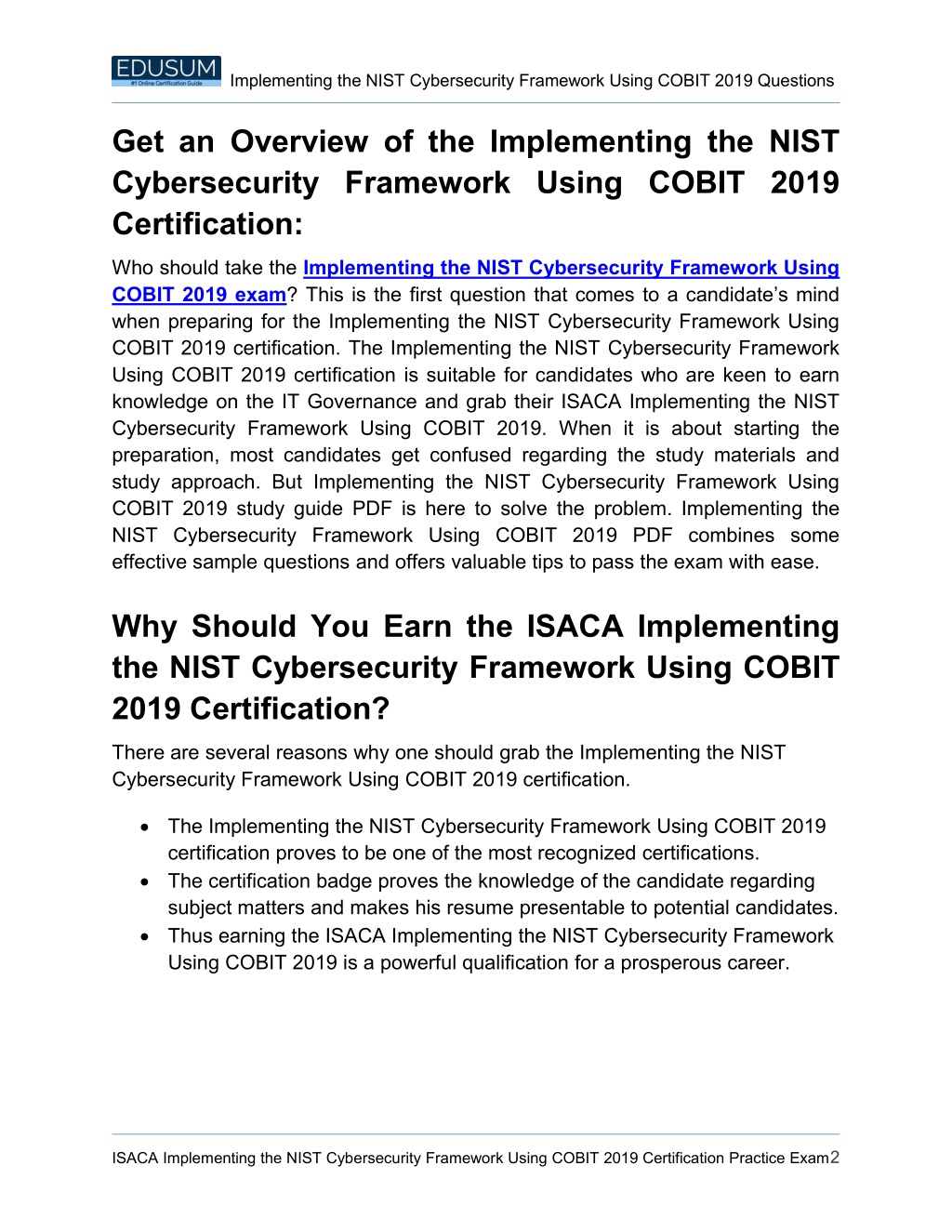 Implementing the NIST Cybersecurity Framework Using COBIT 2019 Questions Get an Overview of the Implementing the NIST Cybersecurity Framework Using COBIT 2019 Certification: Who should take the Implementing the NIST Cybersecurity Framework Using COBIT 2019 exam? This is the first question that comes to a candidate’s mind when preparing for the Implementing the NIST Cybersecurity Framework Using COBIT 2019 certification. The Implementing the NIST Cybersecurity Framework Using COBIT 2019 certification is suitable for candidates who are keen to earn knowledge on the IT Governance and grab their ISACA Implementing the NIST Cybersecurity Framework Using COBIT 2019. When it is about starting the preparation, most candidates get confused regarding the study materials and study approach. But Implementing the NIST Cybersecurity Framework Using COBIT 2019 study guide PDF is here to solve the problem. Implementing the NIST Cybersecurity Framework Using COBIT 2019 PDF combines some effective sample questions and offers valuable tips to pass the exam with ease. Why Should You Earn the ISACA Implementing the NIST Cybersecurity Framework Using COBIT 2019 Certification? There are several reasons why one should grab the Implementing the NIST Cybersecurity Framework Using COBIT 2019 certification. The Implementing the NIST Cybersecurity Framework Using COBIT 2019 certification proves to be one of the most recognized certifications. The certification badge proves the knowledge of the candidate regarding subject matters and makes his resume presentable to potential candidates. Thus earning the ISACA Implementing the NIST Cybersecurity Framework Using COBIT 2019 is a powerful qualification for a prosperous career. ISACA Implementing the NIST Cybersecurity Framework Using COBIT 2019 Certification Practice Exam2