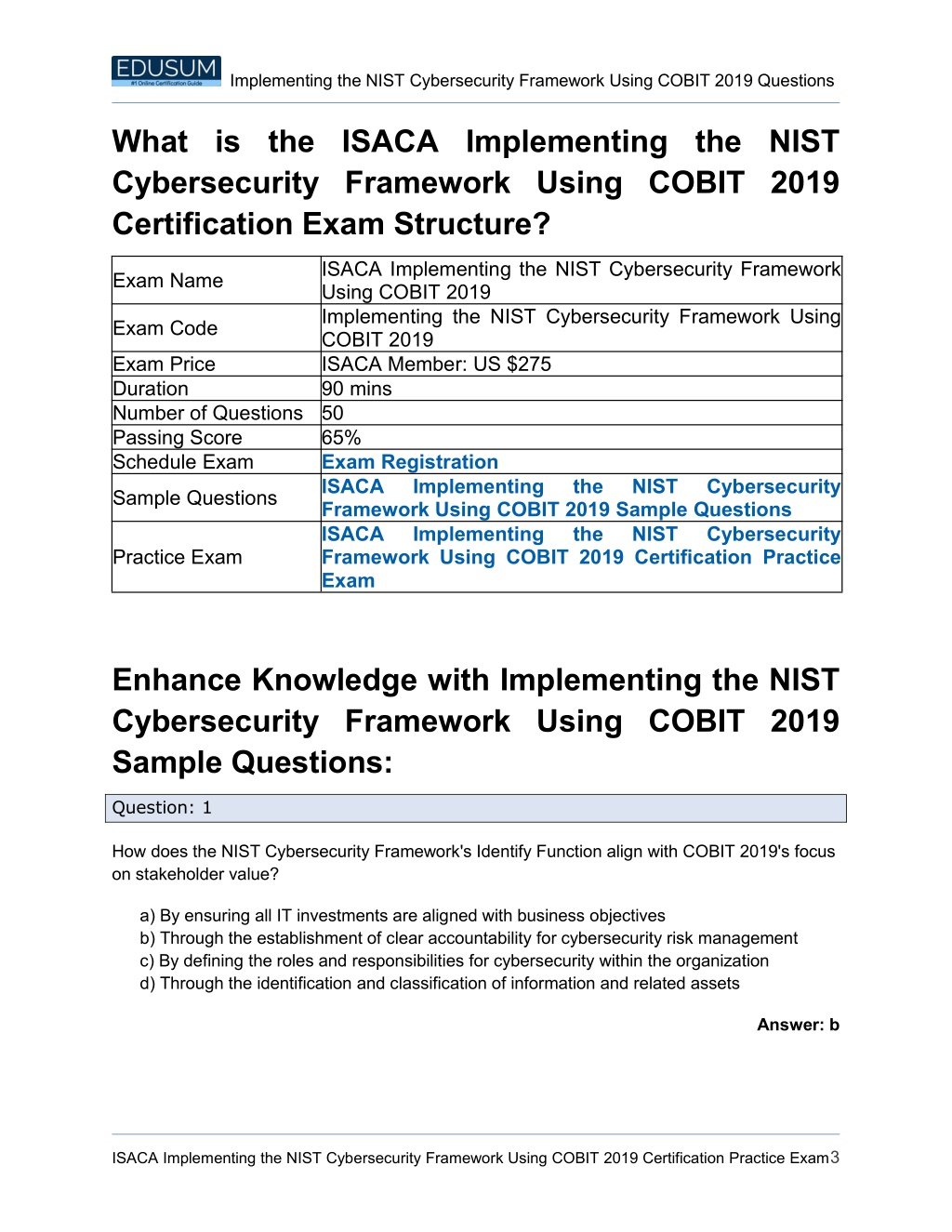 ISACA IMPLEMENTING THE NIST CYBERSECURITY FRAMEWORK USING COBIT 2019 STUDY GUIDE Grab the ISACA Implementing the NIST Cybersecurity Framework Using COBIT 2019 Certification PDF Questions & Answers ISCA IMPLEMENTING THE NIST CYBERSECURITY FRAMEWORK USING COBIT 2019 50 Exam Questions – 65% Cut Score – Duration of 90 minutes