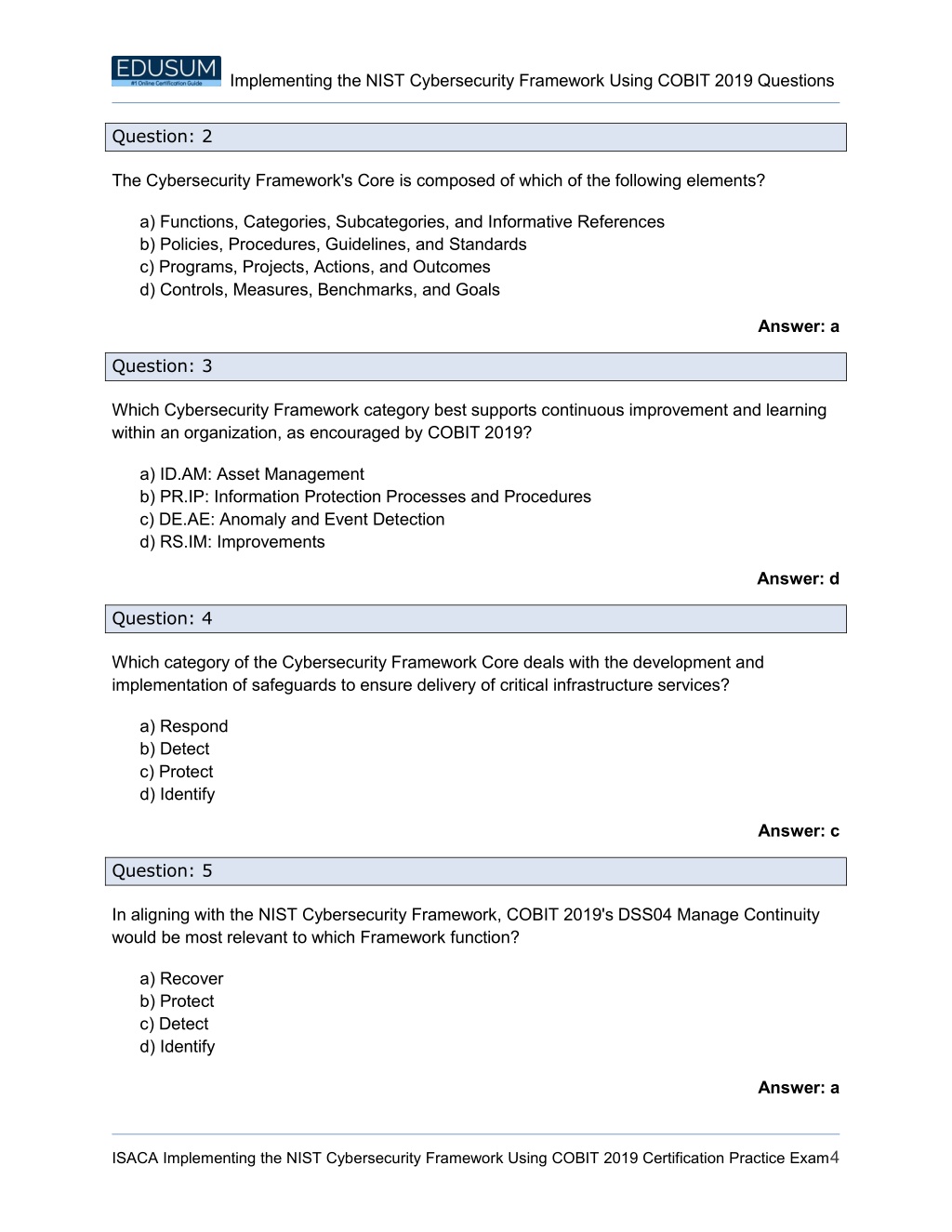 Implementing the NIST Cybersecurity Framework Using COBIT 2019 Questions Question: 2 The Cybersecurity Framework's Core is composed of which of the following elements? a) Functions, Categories, Subcategories, and Informative References b) Policies, Procedures, Guidelines, and Standards c) Programs, Projects, Actions, and Outcomes d) Controls, Measures, Benchmarks, and Goals Answer: a Question: 3 Which Cybersecurity Framework category best supports continuous improvement and learning within an organization, as encouraged by COBIT 2019? a) ID.AM: Asset Management b) PR.IP: Information Protection Processes and Procedures c) DE.AE: Anomaly and Event Detection d) RS.IM: Improvements Answer: d Question: 4 Which category of the Cybersecurity Framework Core deals with the development and implementation of safeguards to ensure delivery of critical infrastructure services? a) Respond b) Detect c) Protect d) Identify Answer: c Question: 5 In aligning with the NIST Cybersecurity Framework, COBIT 2019's DSS04 Manage Continuity would be most relevant to which Framework function? a) Recover b) Protect c) Detect d) Identify Answer: a ISACA Implementing the NIST Cybersecurity Framework Using COBIT 2019 Certification Practice Exam4