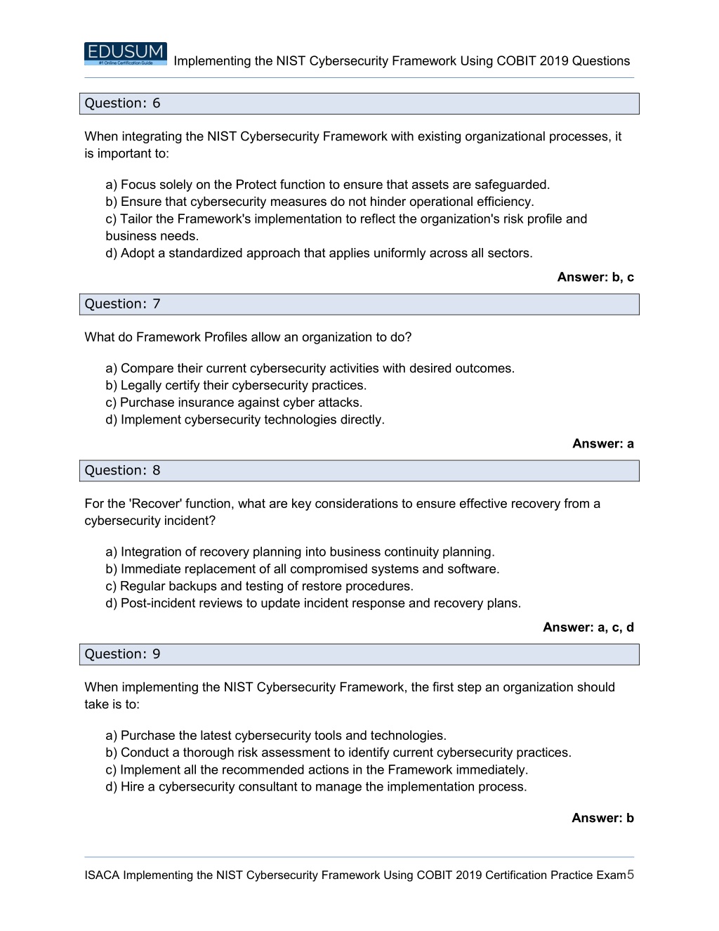 Implementing the NIST Cybersecurity Framework Using COBIT 2019 Questions Question: 6 When integrating the NIST Cybersecurity Framework with existing organizational processes, it is important to: a) Focus solely on the Protect function to ensure that assets are safeguarded. b) Ensure that cybersecurity measures do not hinder operational efficiency. c) Tailor the Framework's implementation to reflect the organization's risk profile and business needs. d) Adopt a standardized approach that applies uniformly across all sectors. Answer: b, c Question: 7 What do Framework Profiles allow an organization to do? a) Compare their current cybersecurity activities with desired outcomes. b) Legally certify their cybersecurity practices. c) Purchase insurance against cyber attacks. d) Implement cybersecurity technologies directly. Answer: a Question: 8 For the 'Recover' function, what are key considerations to ensure effective recovery from a cybersecurity incident? a) Integration of recovery planning into business continuity planning. b) Immediate replacement of all compromised systems and software. c) Regular backups and testing of restore procedures. d) Post-incident reviews to update incident response and recovery plans. Answer: a, c, d Question: 9 When implementing the NIST Cybersecurity Framework, the first step an organization should take is to: a) Purchase the latest cybersecurity tools and technologies. b) Conduct a thorough risk assessment to identify current cybersecurity practices. c) Implement all the recommended actions in the Framework immediately. d) Hire a cybersecurity consultant to manage the implementation process. Answer: b ISACA Implementing the NIST Cybersecurity Framework Using COBIT 2019 Certification Practice Exam5