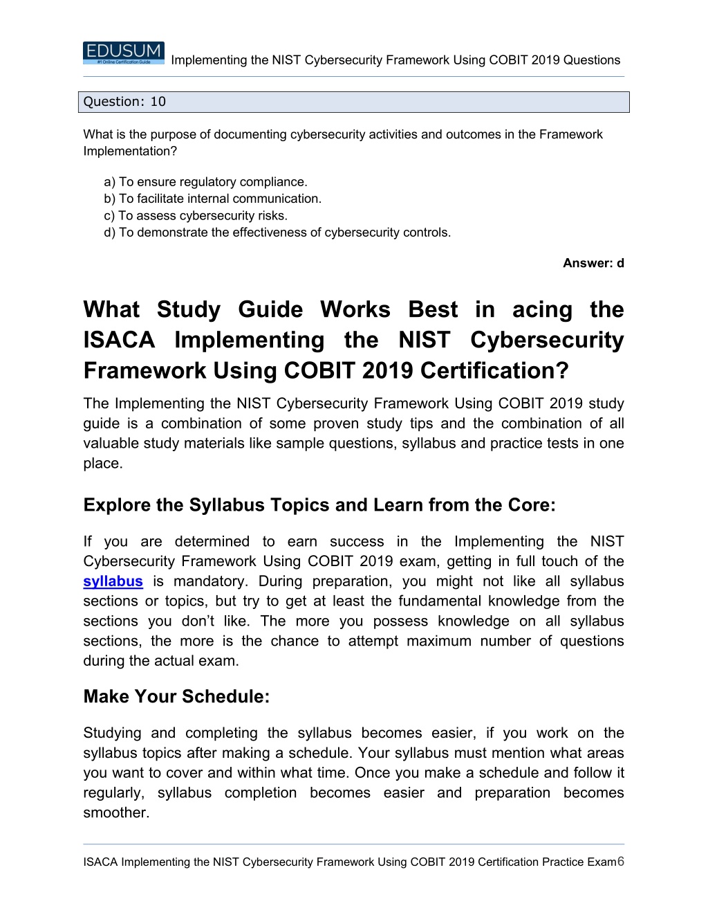 Implementing the NIST Cybersecurity Framework Using COBIT 2019 Questions Question: 10 What is the purpose of documenting cybersecurity activities and outcomes in the Framework Implementation? a) To ensure regulatory compliance. b) To facilitate internal communication. c) To assess cybersecurity risks. d) To demonstrate the effectiveness of cybersecurity controls. Answer: d What Study Guide Works Best in acing the ISACA Implementing the NIST Cybersecurity Framework Using COBIT 2019 Certification? The Implementing the NIST Cybersecurity Framework Using COBIT 2019 study guide is a combination of some proven study tips and the combination of all valuable study materials like sample questions, syllabus and practice tests in one place. Explore the Syllabus Topics and Learn from the Core: If you are determined to earn success in the Implementing the NIST Cybersecurity Framework Using COBIT 2019 exam, getting in full touch of the syllabus is mandatory. During preparation, you might not like all syllabus sections or topics, but try to get at least the fundamental knowledge from the sections you don’t like. The more you possess knowledge on all syllabus sections, the more is the chance to attempt maximum number of questions during the actual exam. Make Your Schedule: Studying and completing the syllabus becomes easier, if you work on the syllabus topics after making a schedule. Your syllabus must mention what areas you want to cover and within what time. Once you make a schedule and follow it regularly, syllabus completion becomes easier and preparation becomes smoother. ISACA Implementing the NIST Cybersecurity Framework Using COBIT 2019 Certification Practice Exam6