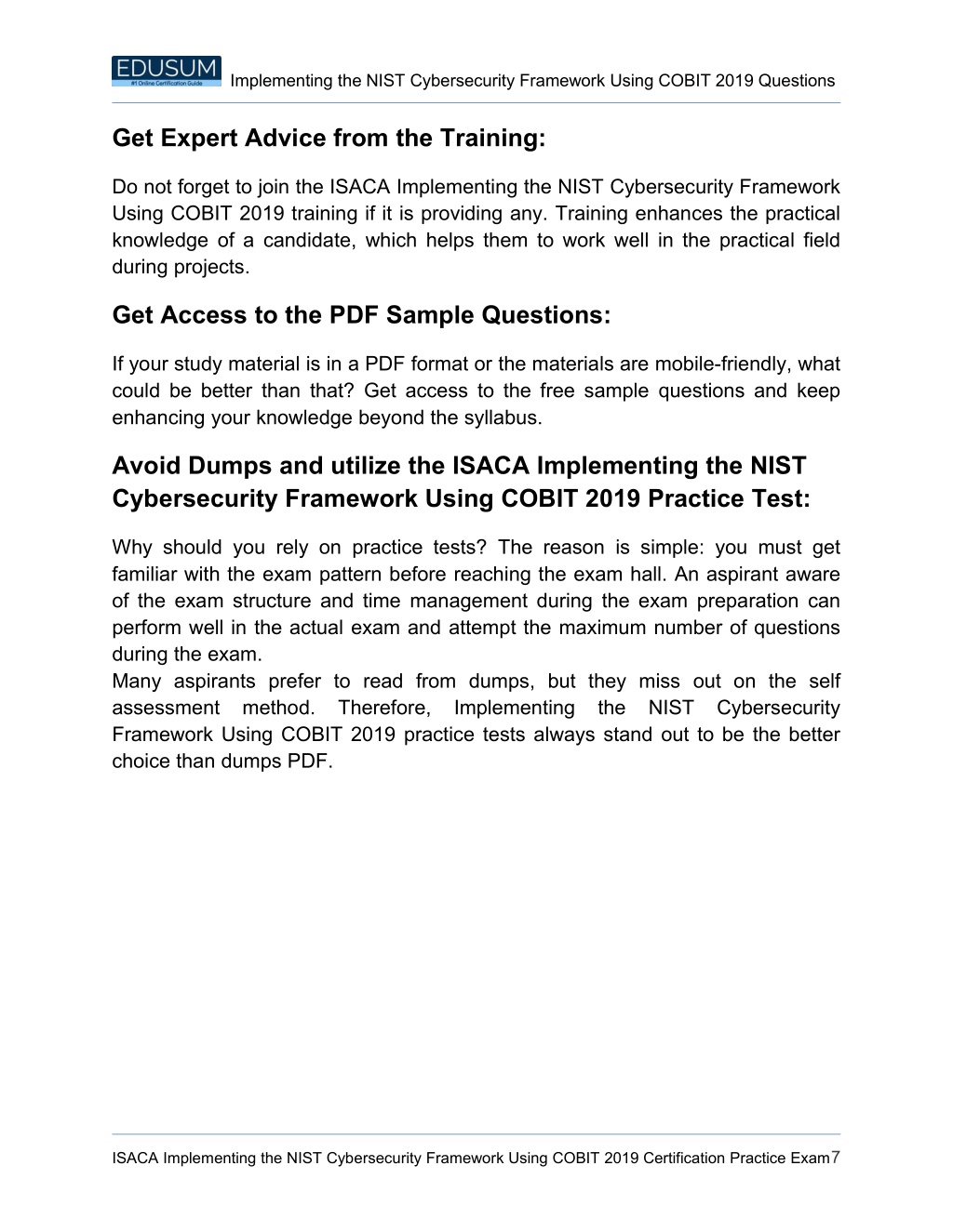 Implementing the NIST Cybersecurity Framework Using COBIT 2019 Questions Get Expert Advice from the Training: Do not forget to join the ISACA Implementing the NIST Cybersecurity Framework Using COBIT 2019 training if it is providing any. Training enhances the practical knowledge of a candidate, which helps them to work well in the practical field during projects. Get Access to the PDF Sample Questions: If your study material is in a PDF format or the materials are mobile-friendly, what could be better than that? Get access to the free sample questions and keep enhancing your knowledge beyond the syllabus. Avoid Dumps and utilize the ISACA Implementing the NIST Cybersecurity Framework Using COBIT 2019 Practice Test: Why should you rely on practice tests? The reason is simple: you must get familiar with the exam pattern before reaching the exam hall. An aspirant aware of the exam structure and time management during the exam preparation can perform well in the actual exam and attempt the maximum number of questions during the exam. Many aspirants prefer to read from dumps, but they miss out on the self assessment method. Therefore, Implementing Framework Using COBIT 2019 practice tests always stand out to be the better choice than dumps PDF. the NIST Cybersecurity ISACA Implementing the NIST Cybersecurity Framework Using COBIT 2019 Certification Practice Exam7