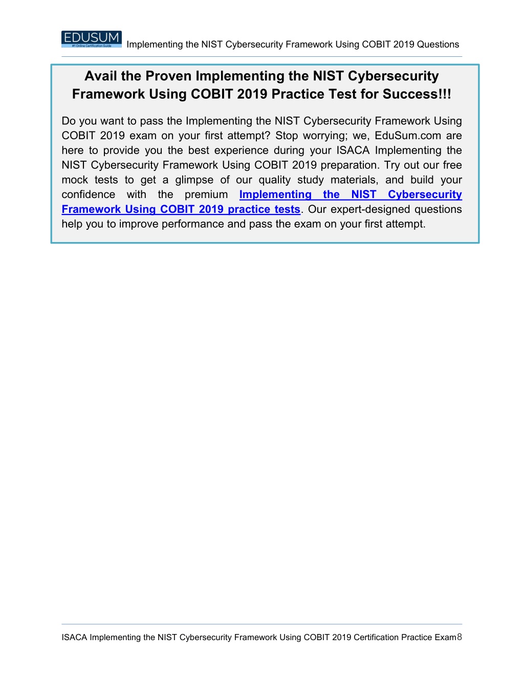 Implementing the NIST Cybersecurity Framework Using COBIT 2019 Questions Avail the Proven Implementing the NIST Cybersecurity Framework Using COBIT 2019 Practice Test for Success!!! Do you want to pass the Implementing the NIST Cybersecurity Framework Using COBIT 2019 exam on your first attempt? Stop worrying; we, EduSum.com are here to provide you the best experience during your ISACA Implementing the NIST Cybersecurity Framework Using COBIT 2019 preparation. Try out our free mock tests to get a glimpse of our quality study materials, and build your confidence with the premium Implementing Framework Using COBIT 2019 practice tests. Our expert-designed questions help you to improve performance and pass the exam on your first attempt. the NIST Cybersecurity ISACA Implementing the NIST Cybersecurity Framework Using COBIT 2019 Certification Practice Exam8