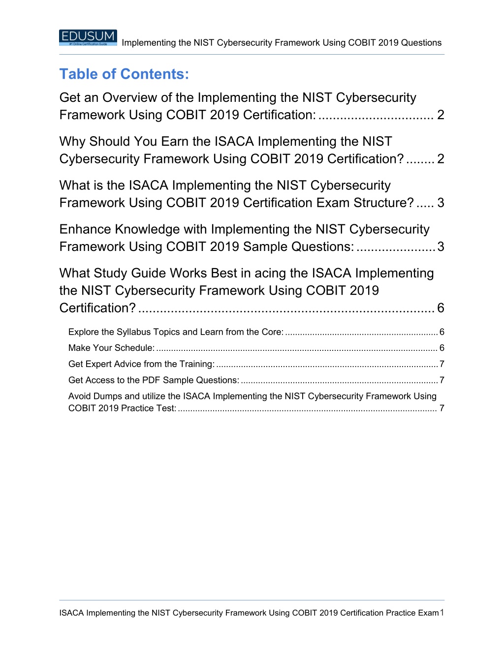 Implementing the NIST Cybersecurity Framework Using COBIT 2019 Questions Table of Contents: Get an Overview of the Implementing the NIST Cybersecurity Framework Using COBIT 2019 Certification:................................ 2 Why Should You Earn the ISACA Implementing the NIST Cybersecurity Framework Using COBIT 2019 Certification?........2 What is the ISACA Implementing the NIST Cybersecurity Framework Using COBIT 2019 Certification Exam Structure?..... 3 Enhance Knowledge with Implementing the NIST Cybersecurity Framework Using COBIT 2019 Sample Questions:......................3 What Study Guide Works Best in acing the ISACA Implementing the NIST Cybersecurity Framework Using COBIT 2019 Certification?..................................................................................6 Explore the Syllabus Topics and Learn from the Core:..............................................................6 Make Your Schedule:..................................................................................................................6 Get Expert Advice from the Training:..........................................................................................7 Get Access to the PDF Sample Questions:................................................................................7 Avoid Dumps and utilize the ISACA Implementing the NIST Cybersecurity Framework Using COBIT 2019 Practice Test:......................................................................................................... 7 ISACA Implementing the NIST Cybersecurity Framework Using COBIT 2019 Certification Practice Exam1