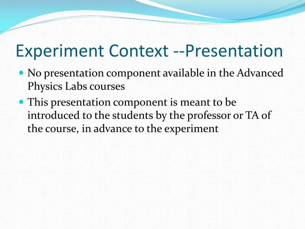 Experiment Context --Presentation • No presentation component available in the Advanced Physics Labs courses • This presentation component is meant to be introduced to the students by the professor or TA of the course, in advance to the experiment