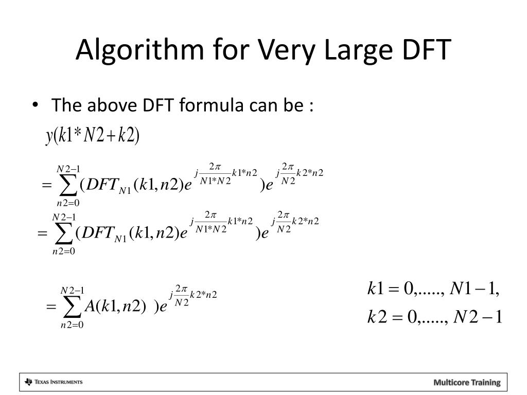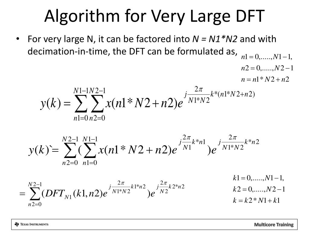 Algorithm for Very Large DFT For very large N, it can be factored into N = N1*N2 and with decimation-in-time, the DFT can be formulated as,