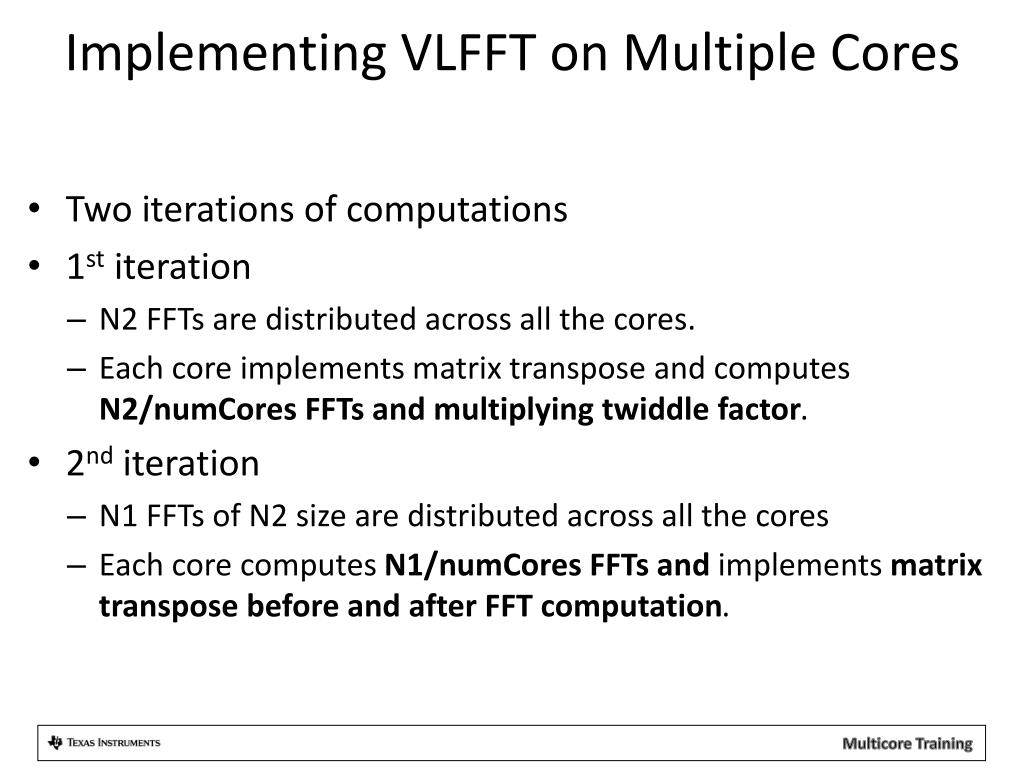 Implementing VLFFT on Multiple Cores • Two iterations of computations • 1st iteration • N2 FFTs are distributed across all the cores. • Each core implements matrix transpose and computes N2/numCores FFTs and multiplying twiddle factor. • 2nd iteration • N1 FFTs of N2 size are distributed across all the cores • Each core computes N1/numCores FFTs and implements matrix transpose before and after FFT computation.