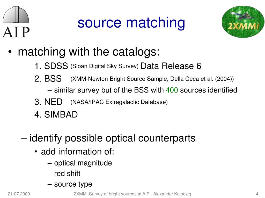 2. Matching • matched with the following catalogs: 1. SDSS (Sloan Digital Sky Survey) Data Release 6 • 62.435sources (with known & unknown source types) • pre-matched catalog with 2XMMi 2. BSS (XMM-Newton Bright Source Sample, from SSC) • 400sources • similar but smaller survey of 2XMMi 3. NED (NASA/IPAC Extragalactic Database) • 163millionsources (with known & unknown source types) • Data-Extraction difficult 4. SIMBAD • 4.6 million sources 2XMMi-Survey of bright sources at AIP - Alexander Kolodzig