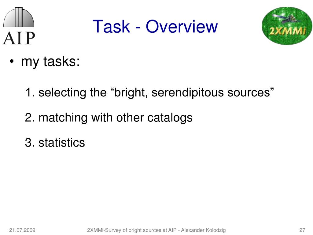Task - Overview • my tasks: 1. selecting the “bright, serendipitous sources” 2. matching with other catalogs 3. statistics 2XMMi-Survey of bright sources at AIP - Alexander Kolodzig