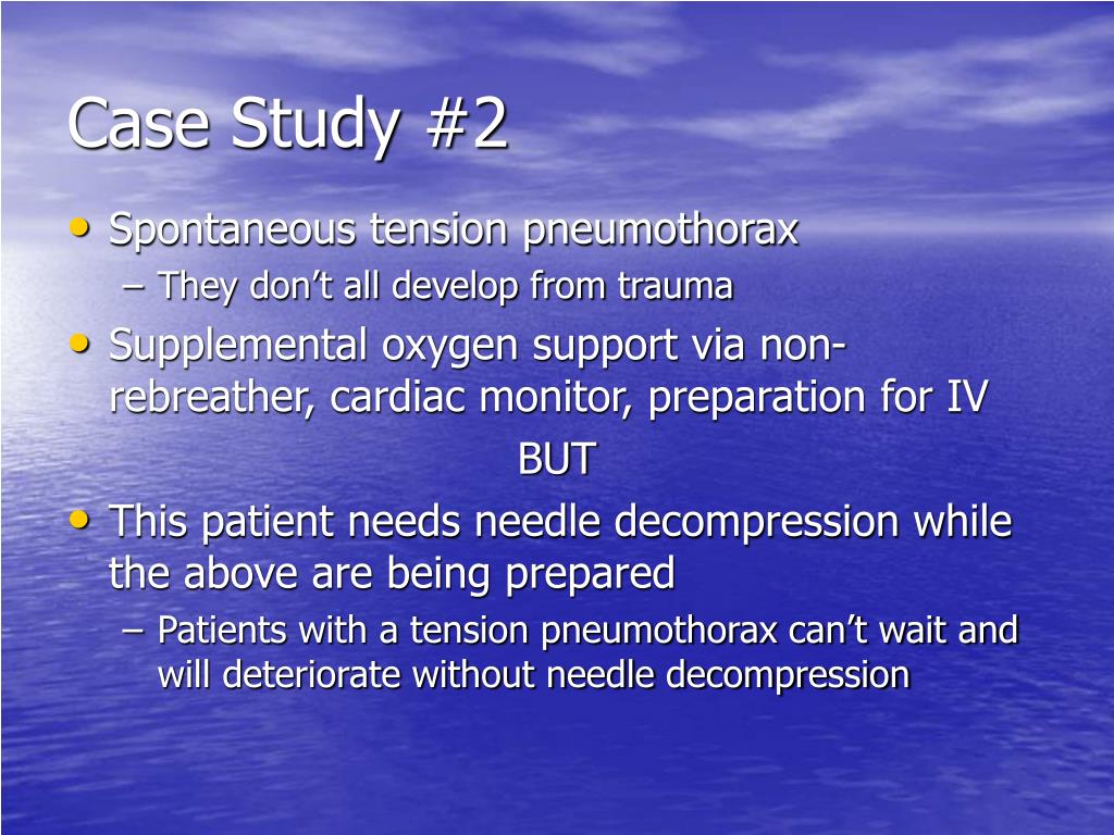 Case Study #2 • Spontaneous tension pneumothorax • They don’t all develop from trauma • Supplemental oxygen support via non-rebreather, cardiac monitor, preparation for IV BUT • This patient needs needle decompression while the above are being prepared • Patients with a tension pneumothorax can’t wait and will deteriorate without needle decompression