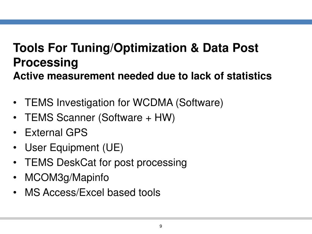 Tools For Tuning/Optimization & Data Post ProcessingActive measurement needed due to lack of statistics • TEMS Investigation for WCDMA (Software) • TEMS Scanner (Software + HW) • External GPS • User Equipment (UE) • TEMS DeskCat for post processing • MCOM3g/Mapinfo • MS Access/Excel based tools