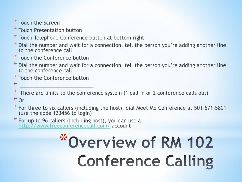 RM 102 Conference Calls. Touch the Screen Touch Presentation button Touch Telephone Conference button at bottom right Dial the number and wait for a connection, tell the person you’re adding another line to the conference call Touch the Conference button