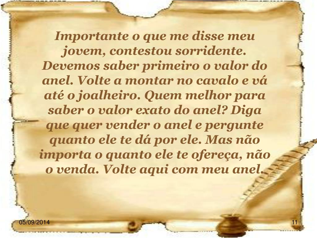 Importante o que me disse meu jovem, contestou sorridente. Devemos saber primeiro o valor do anel. Volte a montar no cavalo e vá até o joalheiro. Quem melhor para saber o valor exato do anel? Diga que quer vender o anel e pergunte quanto ele te dá por ele. Mas não importa o quanto ele te ofereça, não o venda. Volte aqui com meu anel.