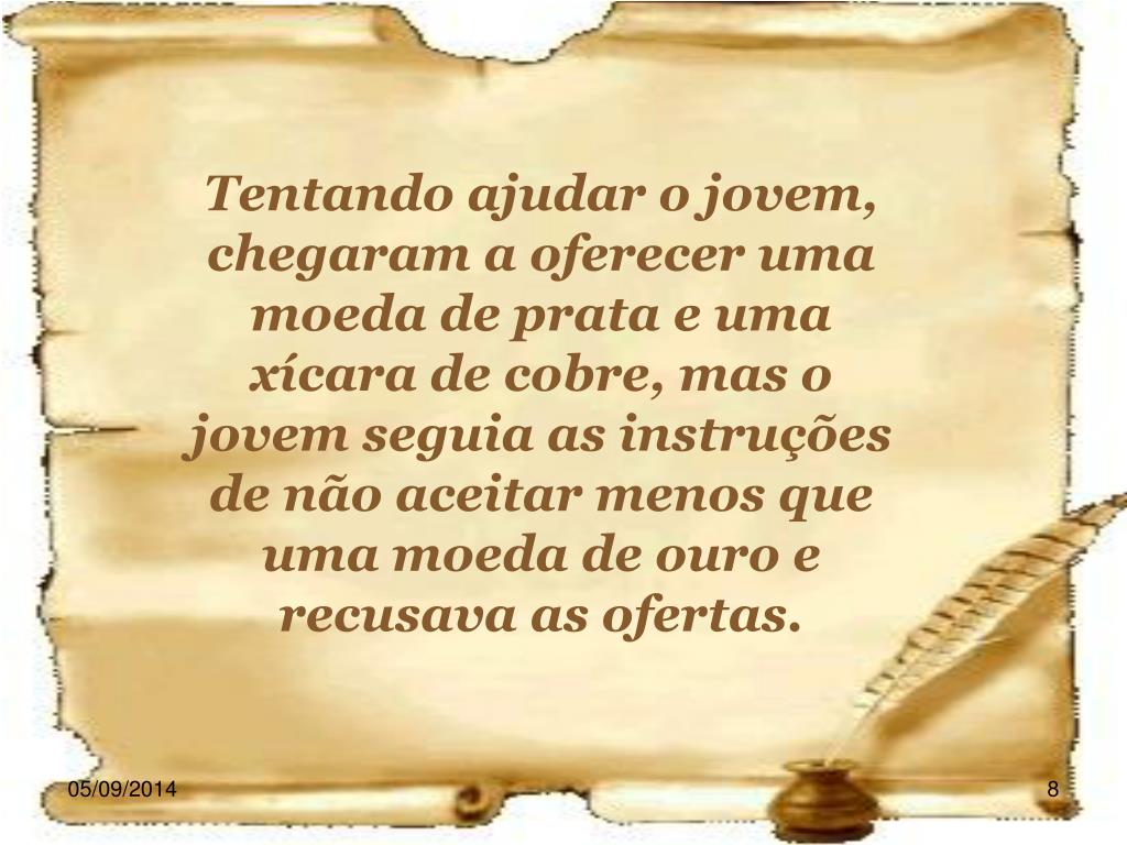 Tentando ajudar o jovem, chegaram a oferecer uma moeda de prata e uma xícara de cobre, mas o jovem seguia as instruções de não aceitar menos que uma moeda de ouro e recusava as ofertas.
