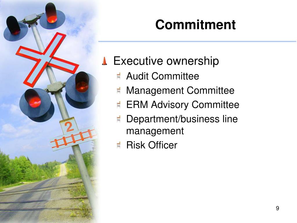 Commitment • Executive ownership • Audit Committee • Management Committee • ERM Advisory Committee • Department/business line management • Risk Officer