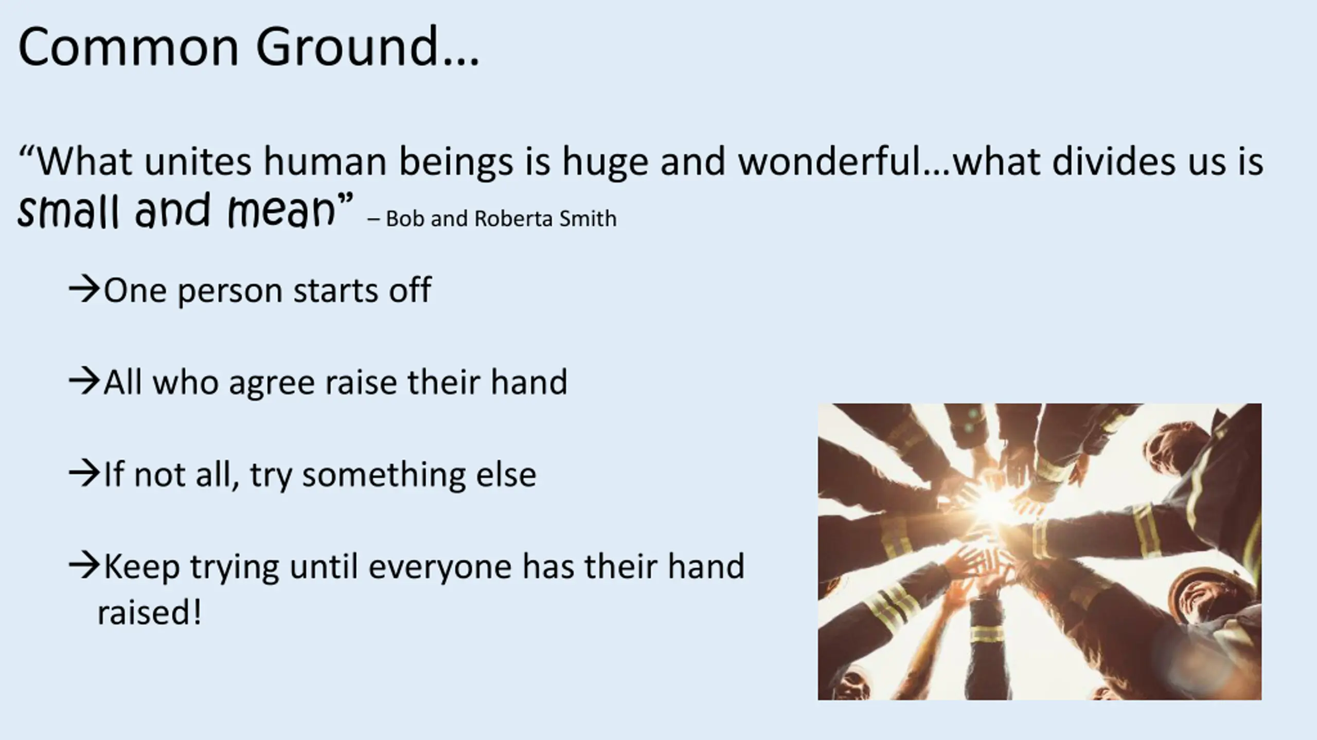 Common Ground… “What unites human beings is huge and wonderful…what divides us is small and mean” – Bob and Roberta Smith One person starts off All who agree raise their hand If not all, try something else Keep trying until everyone has their hand raised!
