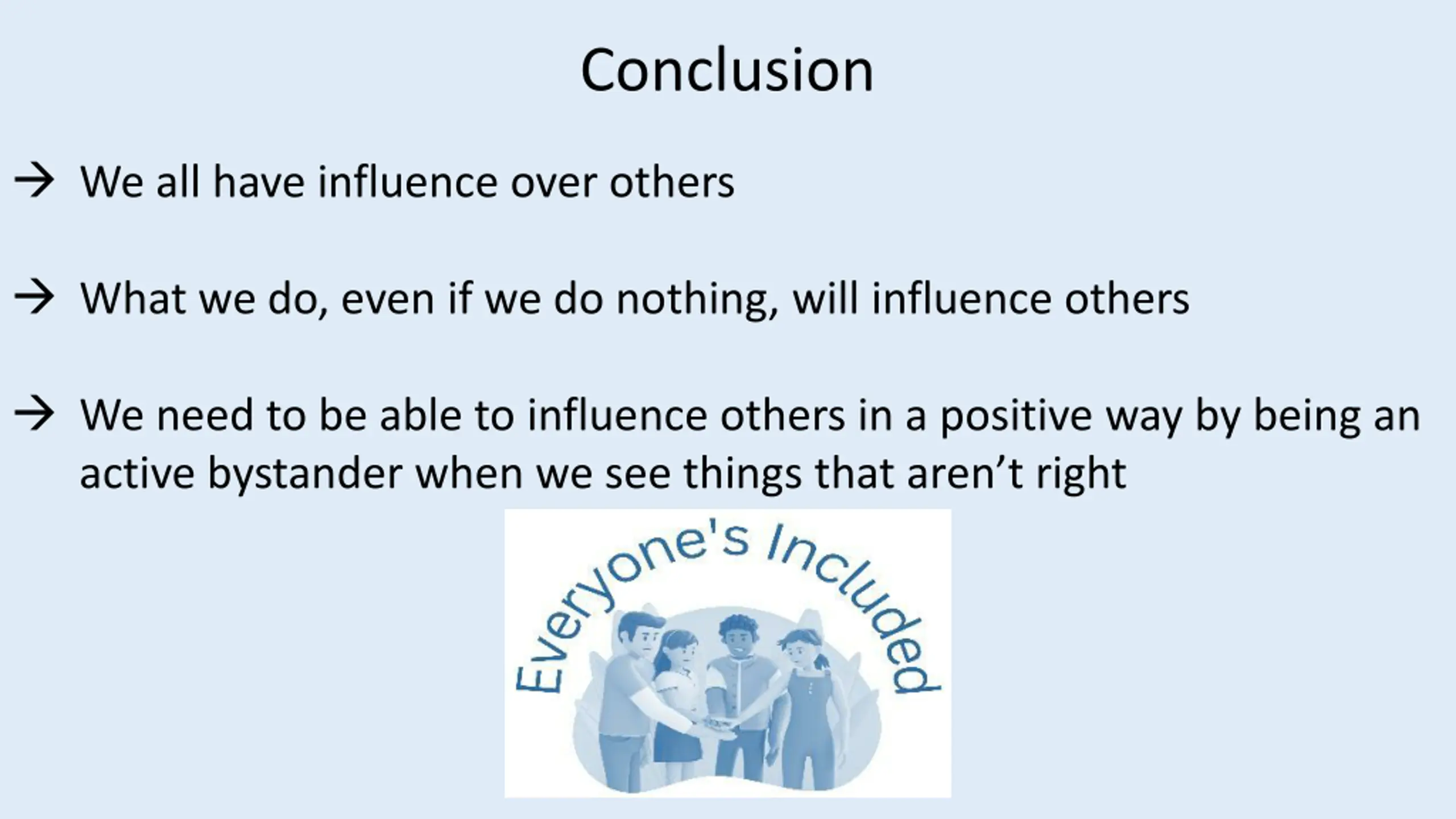 Conclusion We all have influence over others What we do, even if we do nothing, will influence others We need to be able to influence others in a positive way by being an active bystander when we see things that aren’t right