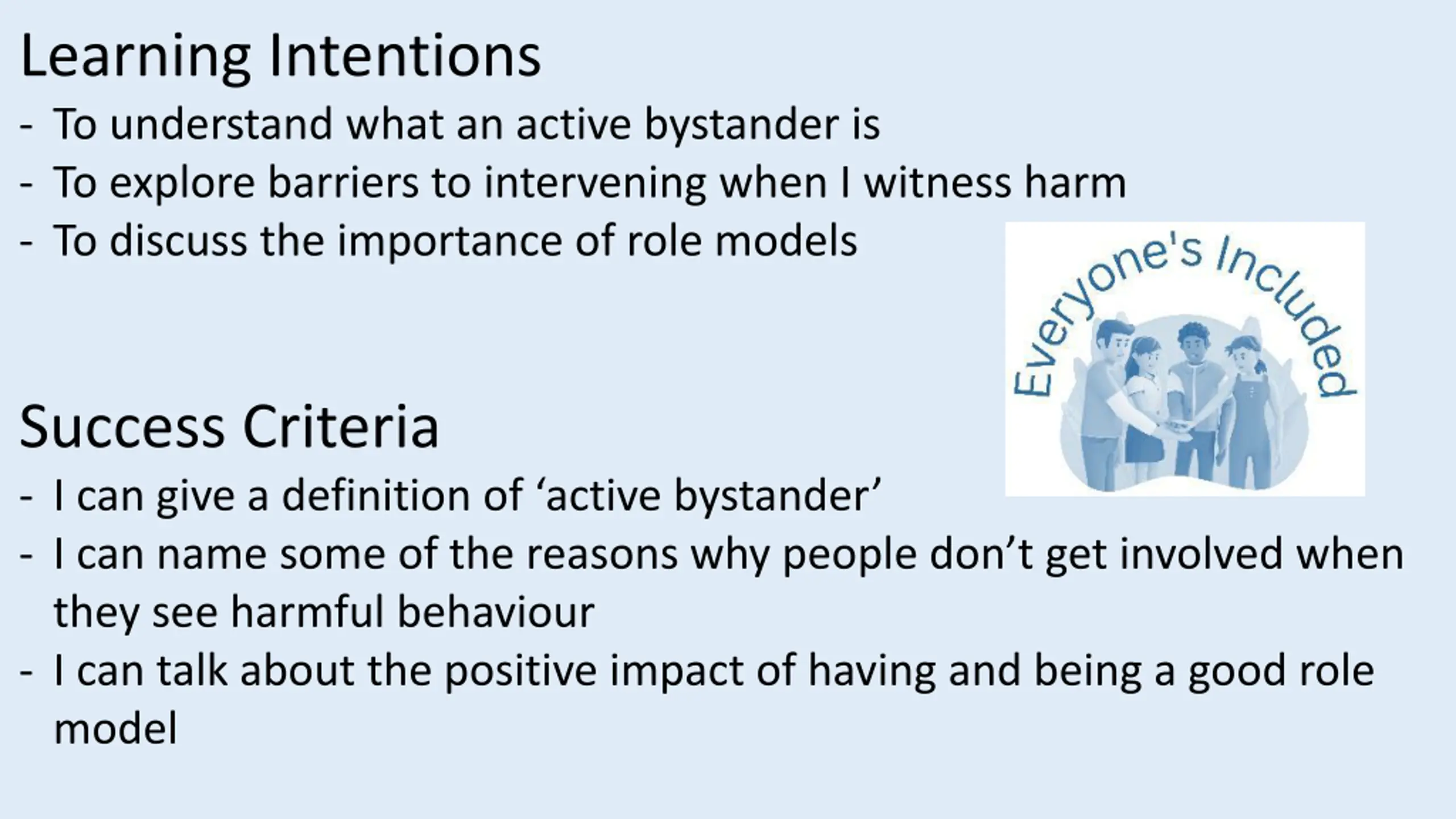Learning Intentions - To understand what an active bystander is - To explore barriers to intervening when I witness harm - To discuss the importance of role models Success Criteria - I can give a definition of ‘active bystander’ - I can name some of the reasons why people don’t get involved when they see harmful behaviour - I can talk about the positive impact of having and being a good role model