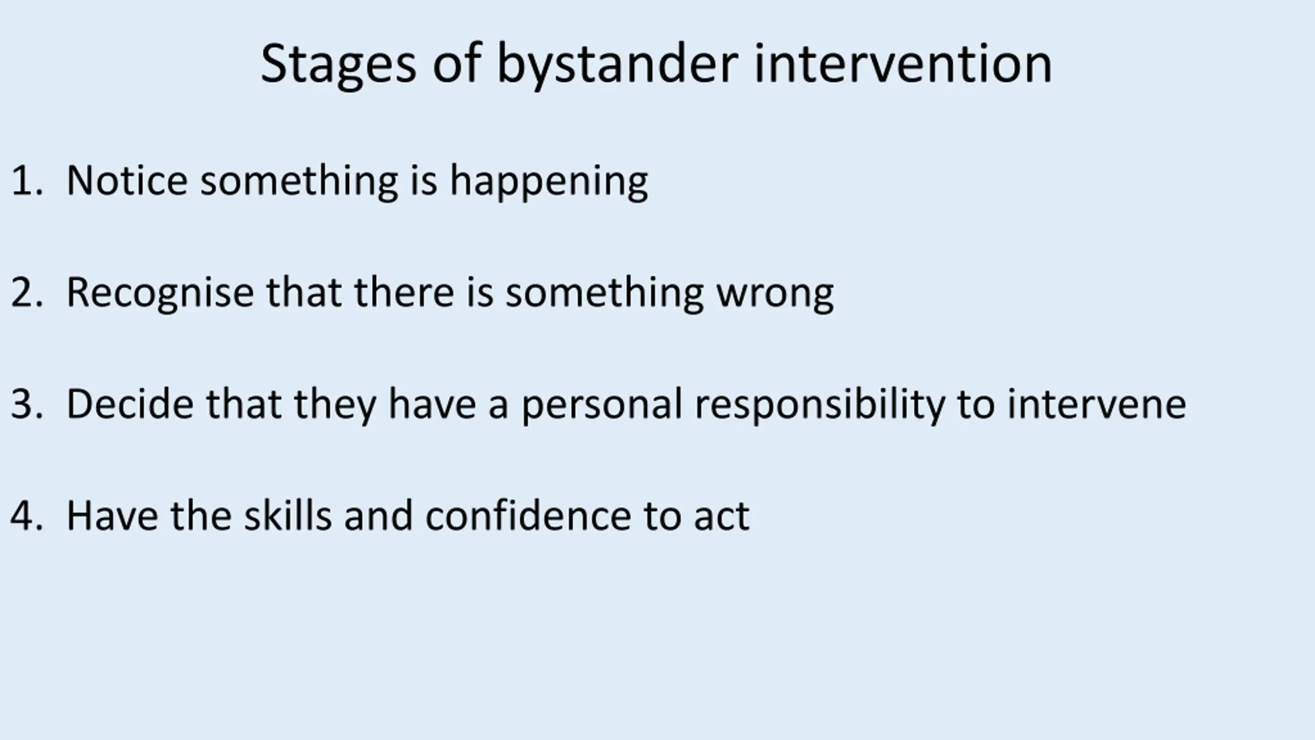 Stages of bystander intervention 1. Notice something is happening 2. Recognise that there is something wrong 3. Decide that they have a personal responsibility to intervene 4. Have the skills and confidence to act