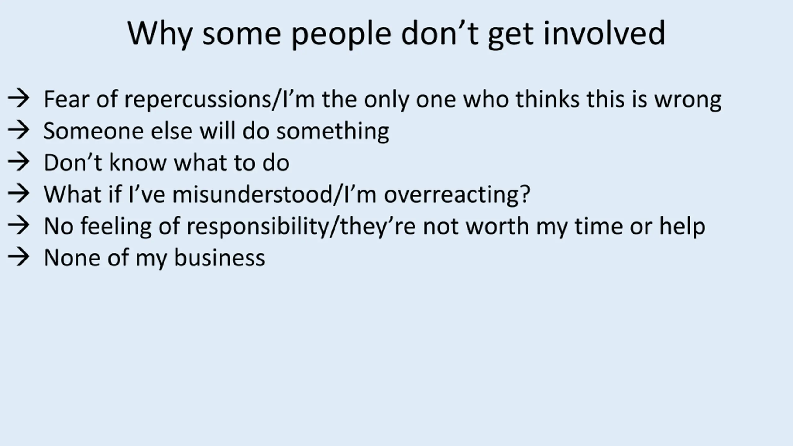 Why some people don’t get involved Fear of repercussions/I’m the only one who thinks this is wrong Someone else will do something Don’t know what to do What if I’ve misunderstood/I’m overreacting? No feeling of responsibility/they’re not worth my time or help None of my business
