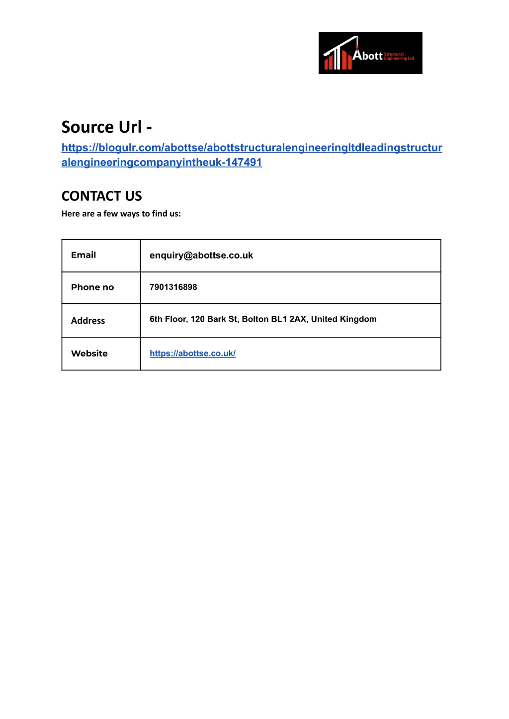 Source Url - https://blogulr.com/abottse/abottstructuralengineeringltdleadingstructur alengineeringcompanyintheuk-147491 CONTACT US Here are a few ways to find us: enquiry@abottse.co.uk Email 7901316898 Phone no 6th Floor, 120 Bark St, Bolton BL1 2AX, United Kingdom Address https://abottse.co.uk/ Website