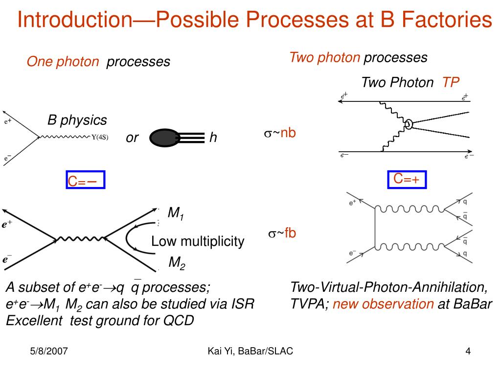 Introduction—Possible Processes at B Factories Two photon processes One photon processes Two Photon TP B physics ~nb or h C= C=+ M1 ~fb Low multiplicity M2 A subset of e+e-qq processes; e+e-M1 M2 can also be studied via ISR Excellent test ground for QCD Two-Virtual-Photon-Annihilation, TVPA; new observation at BaBar Kai Yi, BaBar/SLAC