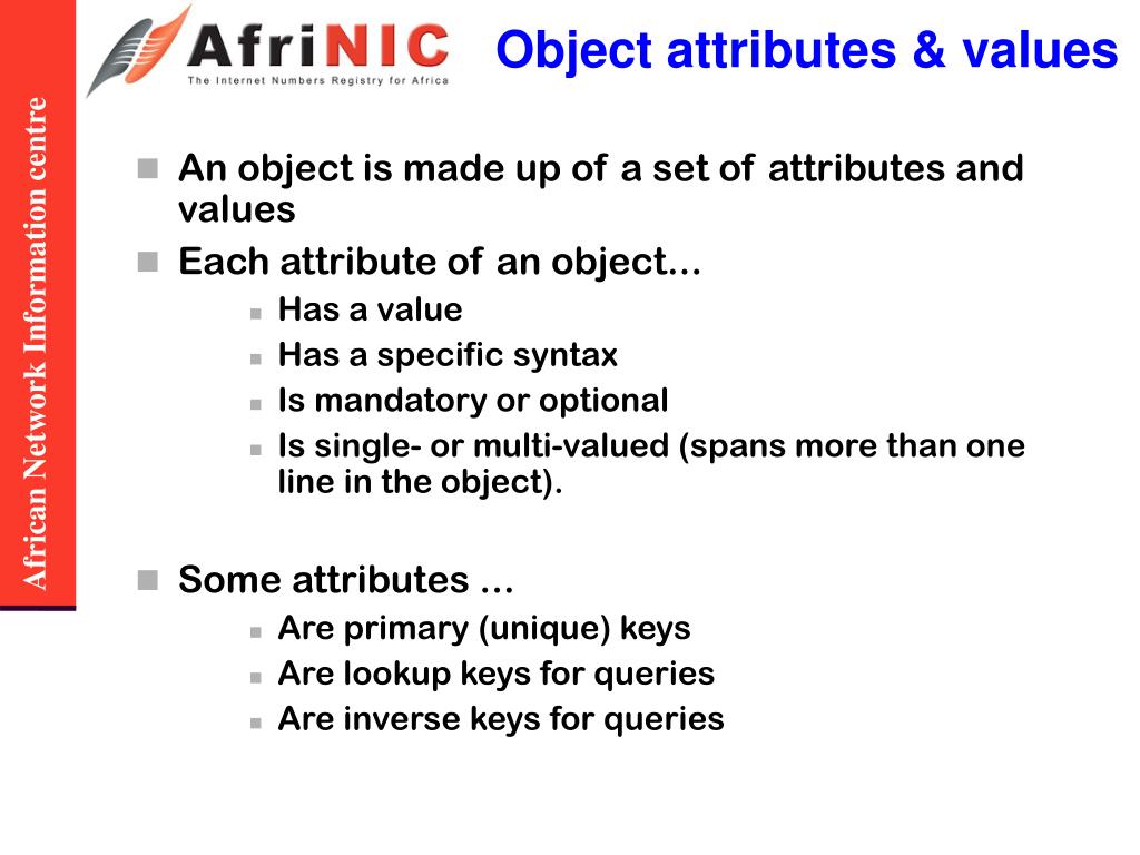 Information storage in the whois database Information is stored in “objects”. There are different “object types” depending on the information stored in an object. http://www.afrinic.net/docs/db/afsup-obj200502.htm