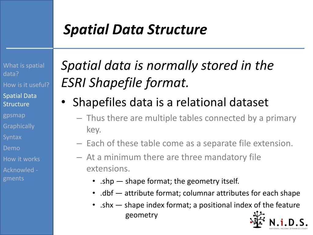 What is spatial data? How is it useful? Spatial Data Structure gpsmap Graphically Syntax Demo How it works Acknowled -gments Acknowledgments and thanks Kevin Crow • shp2dta Reza C. Daniels and SibongileMusundwa • Co-authors and testing Louise De Villiers, Michelle Chinhema and the rest of the NIDS team. • Support utilization and testing gpsmap. • Email: tslbrophy@gmail.com • Nids: http://www.nids.uct.ac.za