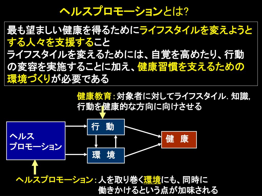 ヘルス プロモーション 行 動 健 康 環 境 ヘルスプロモーションとは? 最も望ましい健康を得るためにライフスタイルを変えようとする人々を支援すること ライフスタイルを変えるためには、自覚を高めたり、行動の変容を実施することに加え、健康習慣を支えるための環境づくりが必要である 健康教育:対象者に対してライフスタイル. 知識, 行動を健康的な方向に向けさせる ヘルスプロモーション:人を取り巻く環境にも、同時に 働きかけるという点が加味される