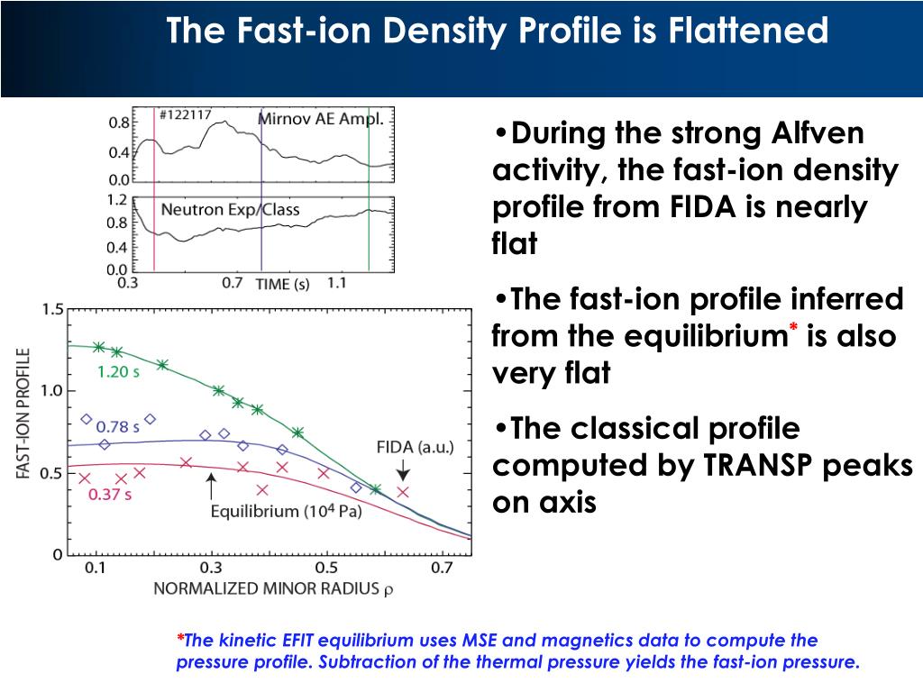 The Fast-ion Density Profile is Flattened • During the strong Alfven activity, the fast-ion density profile from FIDA is nearly flat • The fast-ion profile inferred from the equilibrium* is also very flat • The classical profile computed by TRANSP peaks on axis R0 V2 V2 *The kinetic EFIT equilibrium uses MSE and magnetics data to compute the pressure profile. Subtraction of the thermal pressure yields the fast-ion pressure.