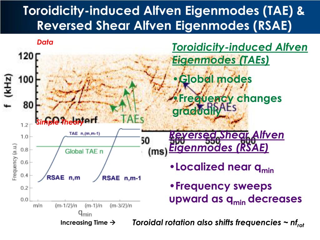 Data • Toroidicity-induced Alfven Eigenmodes (TAEs) • Global modes • Frequency changes gradually Simple Theory • Reversed Shear Alfven Eigenmodes (RSAE) • Localized near qmin • Frequency sweeps upward as qmin decreases Toroidal rotation also shifts frequencies ~ nfrot Increasing Time Toroidicity-induced Alfven Eigenmodes (TAE) & Reversed Shear Alfven Eigenmodes (RSAE) R0 V2 V2