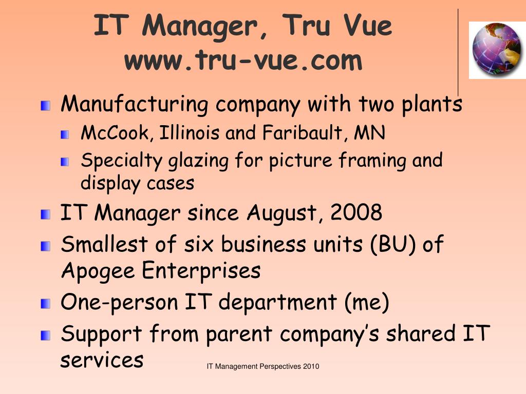 IT Manager, Tru Vuewww.tru-vue.com • Manufacturing company with two plants • McCook, Illinois and Faribault, MN • Specialty glazing for picture framing and display cases • IT Manager since August, 2008 • Smallest of six business units (BU) of Apogee Enterprises • One-person IT department (me) • Support from parent company’s shared IT services IT Management Perspectives 2010